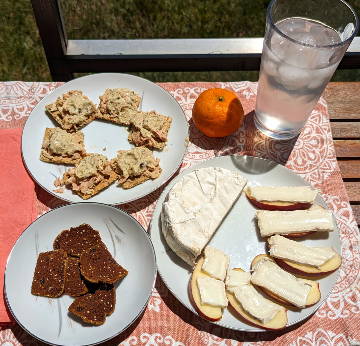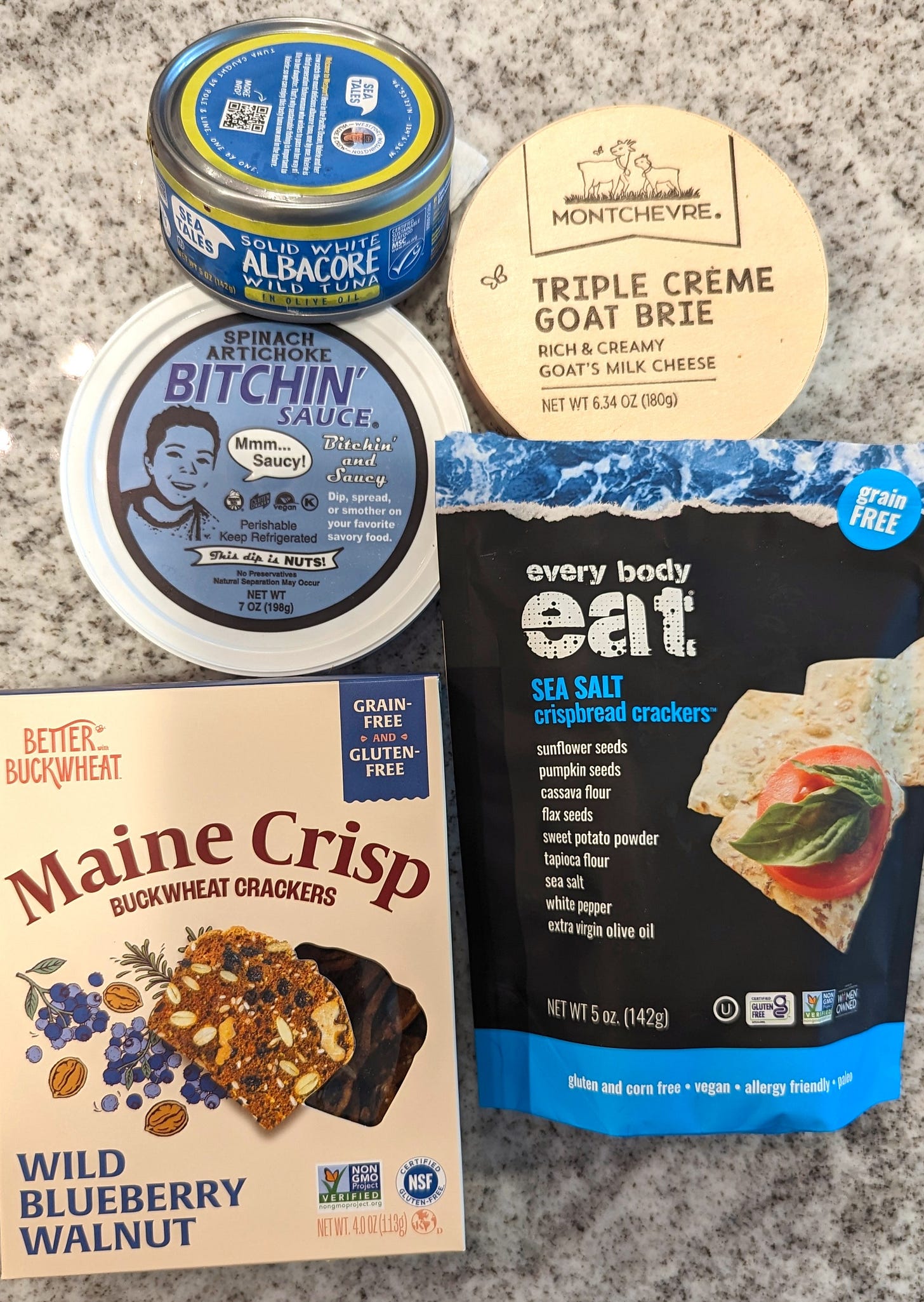 Protein alternatives for this lunch or snack include other types of canned fish (salmon, anchovies, skip jack, etc.) or almond/hazelnut butter on the crackers, left-over chicken from dinner, mixed tree nuts, eggs, goat cheese, or a lettuce salad with a hard boiled egg or two.